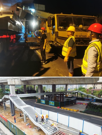 由于人行天橋項(xiàng)目建設(shè)所處的位置地下含高壓線等管線,施工環(huán)境較為復(fù)雜,且又處在交通通行量大的東環(huán)高速高架橋下,由于空間受限,鋼箱梁吊裝與高架橋最近的距離僅有5公分,吊裝難度極大。為此,我們采取雙吊車協(xié)同施工、錯(cuò)峰施工和夜間施工的辦法。為確保施工安全,市政集團(tuán)從上至下高度重視,由集團(tuán)領(lǐng)導(dǎo)帶隊(duì),項(xiàng)目總工及各職能部門主要人員齊上陣,從交通協(xié)調(diào),運(yùn)梁車跟隨指導(dǎo),安全措施落實(shí)及現(xiàn)場(chǎng)架梁的線位等多方面進(jìn)行把控,主要負(fù)責(zé)人靠前指揮,帶領(lǐng)黨員干部及時(shí)協(xié)調(diào)解決吊裝過程中遇到的問題,充分發(fā)揮出黨支部戰(zhàn)斗堡壘和黨員的模范帶頭作用。
