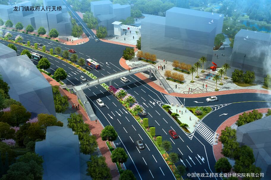 龍門鎮人民政府人行天橋位于羅龍西路龍門鎮人民政府西側約80米處,采用鋼結構連續梁,腹板為圓弧形,主梁全長44.8米,寬4.0米。梯道坡度1:2,兩側長分別為16.9米、15.7米,寬2.8米,總投資約400萬元。