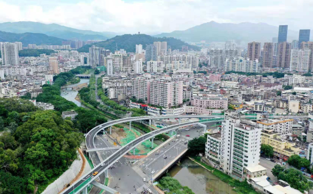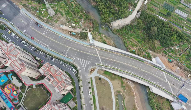 羅橋節(jié)點改造提升工程2019年11月開工建設,2021年8月建成通車。該項目沿北環(huán)西路、龍興路設置南北分離式雙向四車道高架,南側(cè)接龍興路,北側(cè)接現(xiàn)狀北環(huán)西路,高架靠東側(cè)布置(緊貼烈士陵園),橋梁總長約1140米,凈寬約7.7米;在雙洋路、龍川北路、北環(huán)西路設置人行天橋,與山體步道銜接,以完善慢行系統(tǒng);在烈士陵園山體下采用明挖回填方式設置框涵,長度約225米,凈寬10.75米工程投資1.4億元。