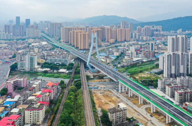 龍巖大道高架橋2013年9月開工建設,2020年10月建成通車。該項目地面道路長3395米,寬78米;高架橋部分長2329米,標準段寬26米,含一座(190+150)米的獨塔雙索面斜拉橋,斜拉橋?qū)?4.2米;葫蘆溪分洪工程長667米,標準段結(jié)構(gòu)7.5×3.9米,總投資24億元。